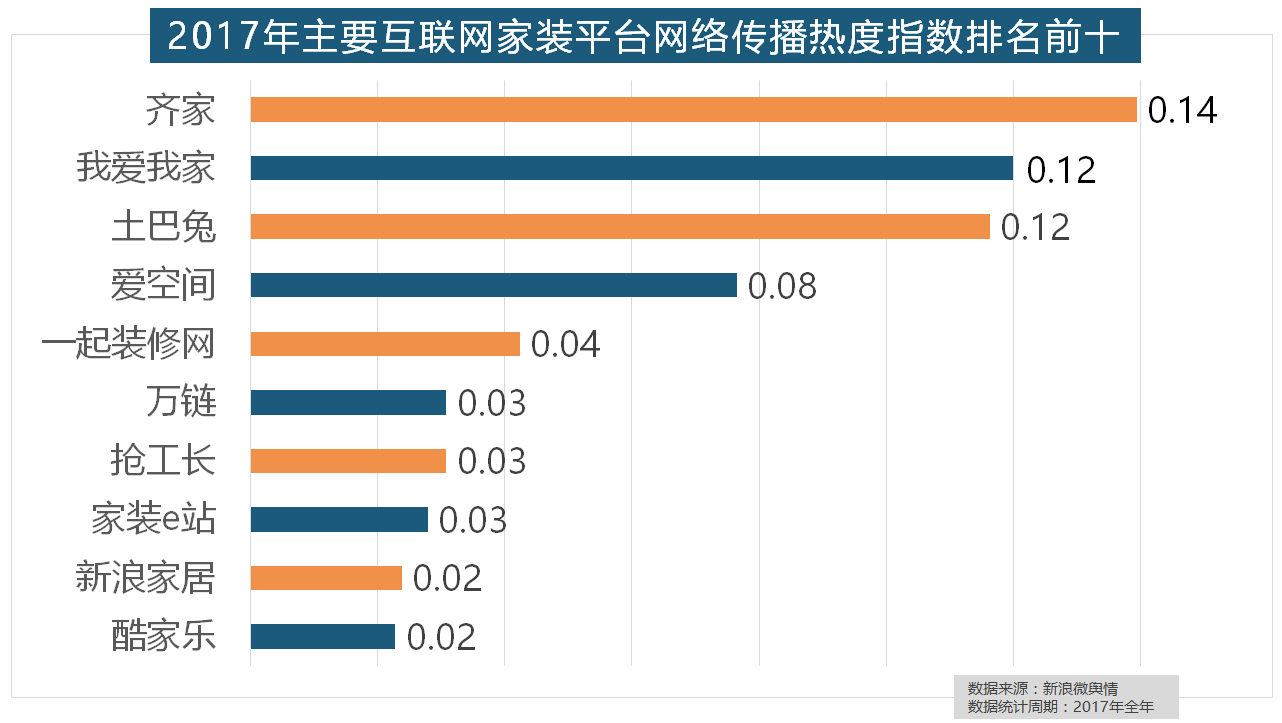 除各保守家拆设想企业逐鹿我国度拆市场外,但正在2017年所受关心无限,2017年,正在收集热度指数排名前十的品牌中,齐家、我爱我家、土巴兔、爱空间、一路拆修网的收集热度指数排名前五,